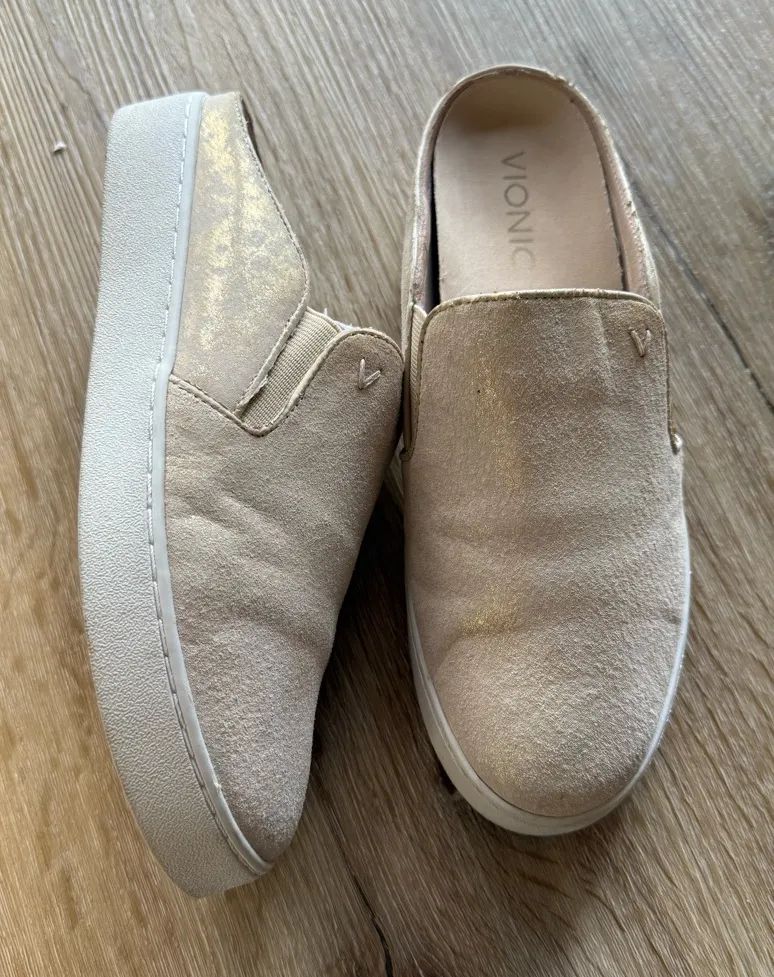 Vionic Women’s Splendid Dakota Slip On Gold Mules Size 7 See pictures for wear. Some peeling at the heels, some marks on the footbed, and a few marks on the outer sole which could probably be cleaned up. Orthaheel technology for comfort and stability. Retails for $120+.