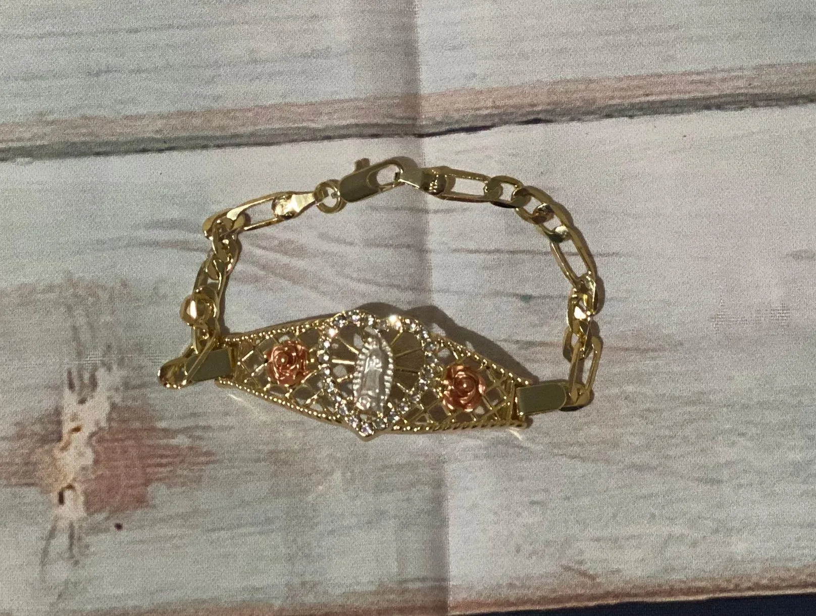 Brand New 8” Guadalupe With Flowers Figaro Bracelet White Guadalupe Medallion Rose Flower Design White Color CZ Stones Figaro Chain Nickel Free Hypoallergenic 14 K Italian Three Tone Plating