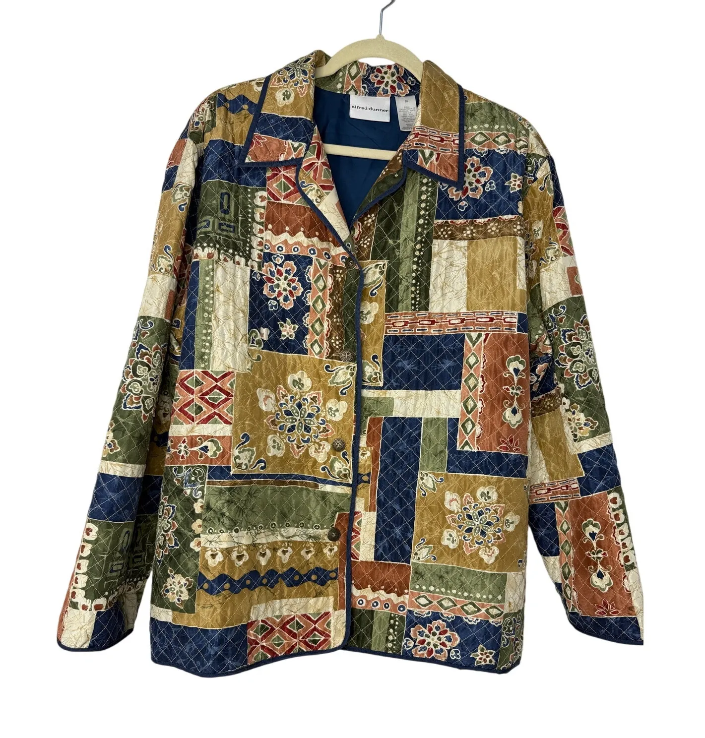 Beautiful vintage Alfred Dunner 100% Silk Quilted Patchwork Jacket in a rich tapestry of boho, folk-art, cottagecore, eclectic, and vintage-inspired prints. Features a mix of olive green, navy blue, tan, rust, and cream in a quilt-style block pattern with subtle floral and geometric motifs. Classic button-front silhouette with antique-style metal buttons, contrast piping, and a fully lined interior. Soft, lightweight quilting gives it a cozy yet polished feel — perfect as a statement topper for any season. This piece channels artsy maximalist, lagenlook, granny-chic, quiltcore, Americana, and heritage craft aesthetics. Size: 20 Shell: 100% Silk Lining: 100% Polyester Care: Hand wash, dry flat Condition: Excellent pre-owned condition. No flaws noted.