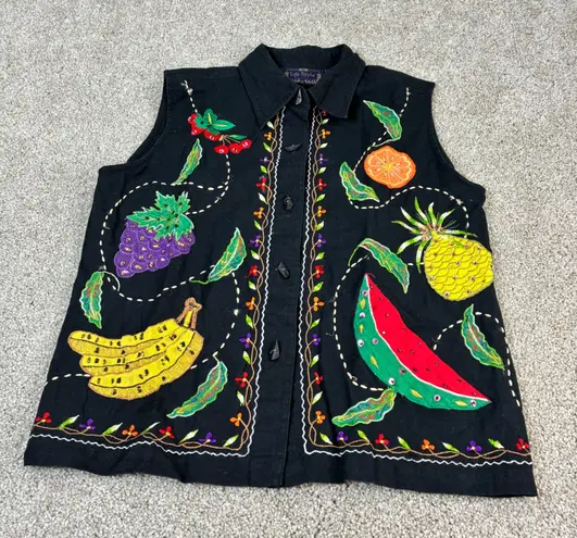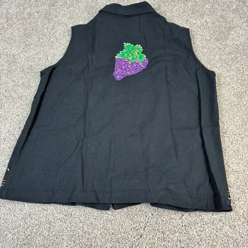Pit to pit 19" Length 22" Type: Vest Outer Shell Material: Linen Blend Style: Basic Jacket Department: Women Color: Black Lining Material: 100% Cotton Features: Embroidered, Button Up, Sleeveless, Fruit Theme, Novelty Fabric Type: Linen Accents: Embroidered, Button Pattern: Floral Season: Spring, Summer Closure: Button Occasion: Casual Keywords: fruit vest, embroidered vest, black vest, linen vest, sleeveless top, button up vest, vintage vest, retro vest, novelty vest, fruitcore, tropical vest, unique vest, statement vest, casual vest, summer vest