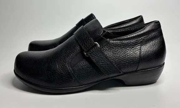 *There is a tear in the back collar of the left shoe. See the last photo for a close up. They are in otherwise like new condition. Tumbled leather upper Slip-on with hook and loop strap Round toe Synthetic lining Removable Ultra Cushioned Tiny Pillows insole 1.25" heel Synthetic sole US Women’s 7W (Wide(