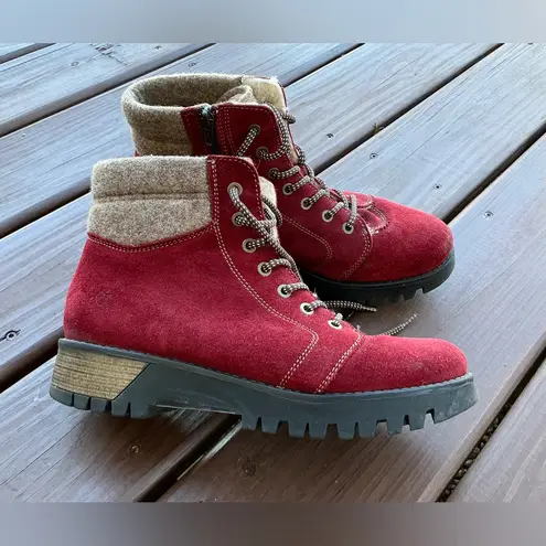 Well know ,great rater BOS.& CO brand booties- made in Portugal- in great preloved condition. Genuine suede leather + felt+ wool lining ,high top with soft felt edge, nice merry burgundy color ( looks a bit lighter in photos) ,waterproof, ultra warm, pretty and comfy. Have not been worn much, clean in and out. Some marks on heels not even noticeable when wearing. Orig.$249