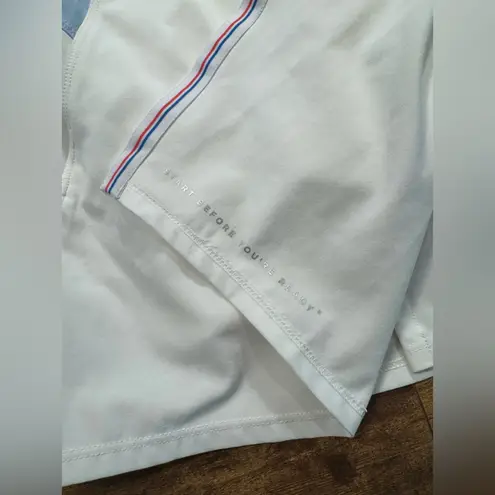 These skorts feature a sleek wrap-around design in a fresh white with a contrasting blue waistband.... Show more