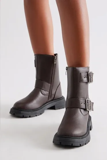 Stylish brown ankle boots. Features double buckle design. Durable black sole.