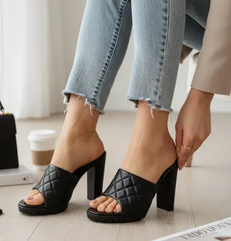 Stylish black quilted mules with high heels. Perfect for any occasion.