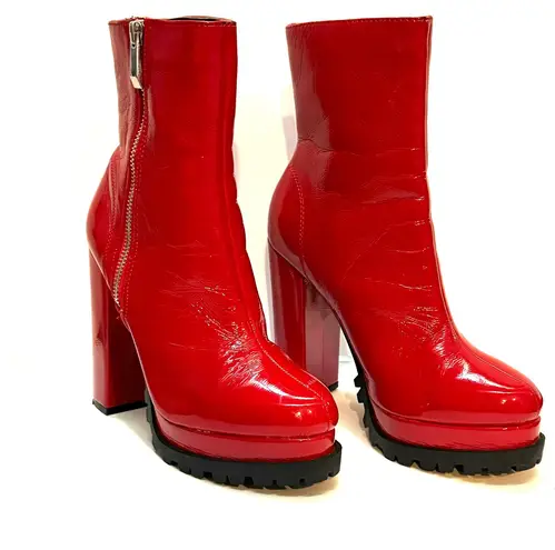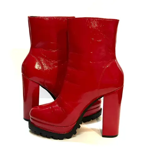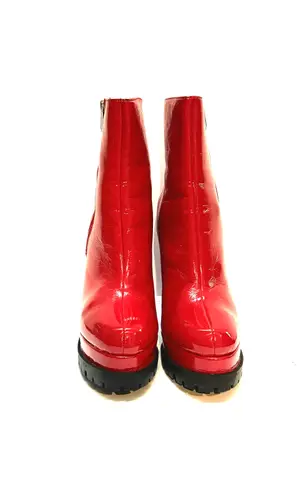 These ankle boots boast high heels and platforms, crafted from vibrant red patent leather by the ren... Show more