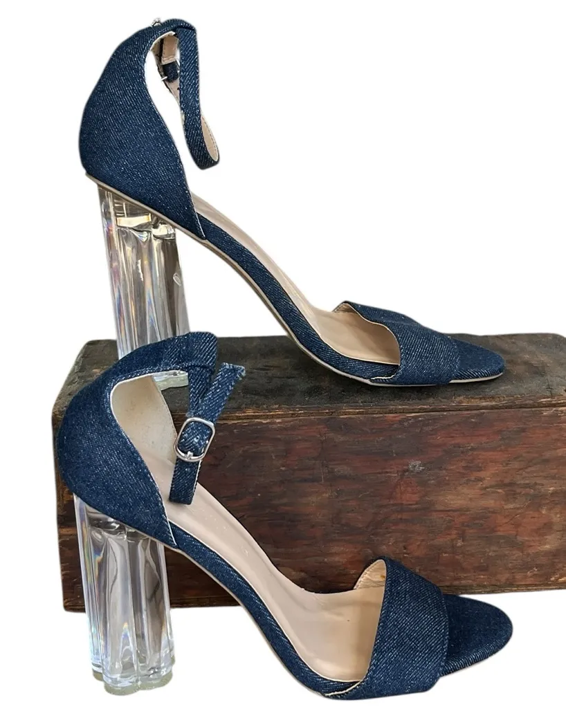 Features an open toe front, with single band Chunky clear heel, adjustable ankle strap Lightly padde... Show more