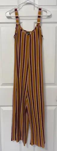Bold striped jumpsuit with mustard and pink hues. Sleeveless design for versatile wear.