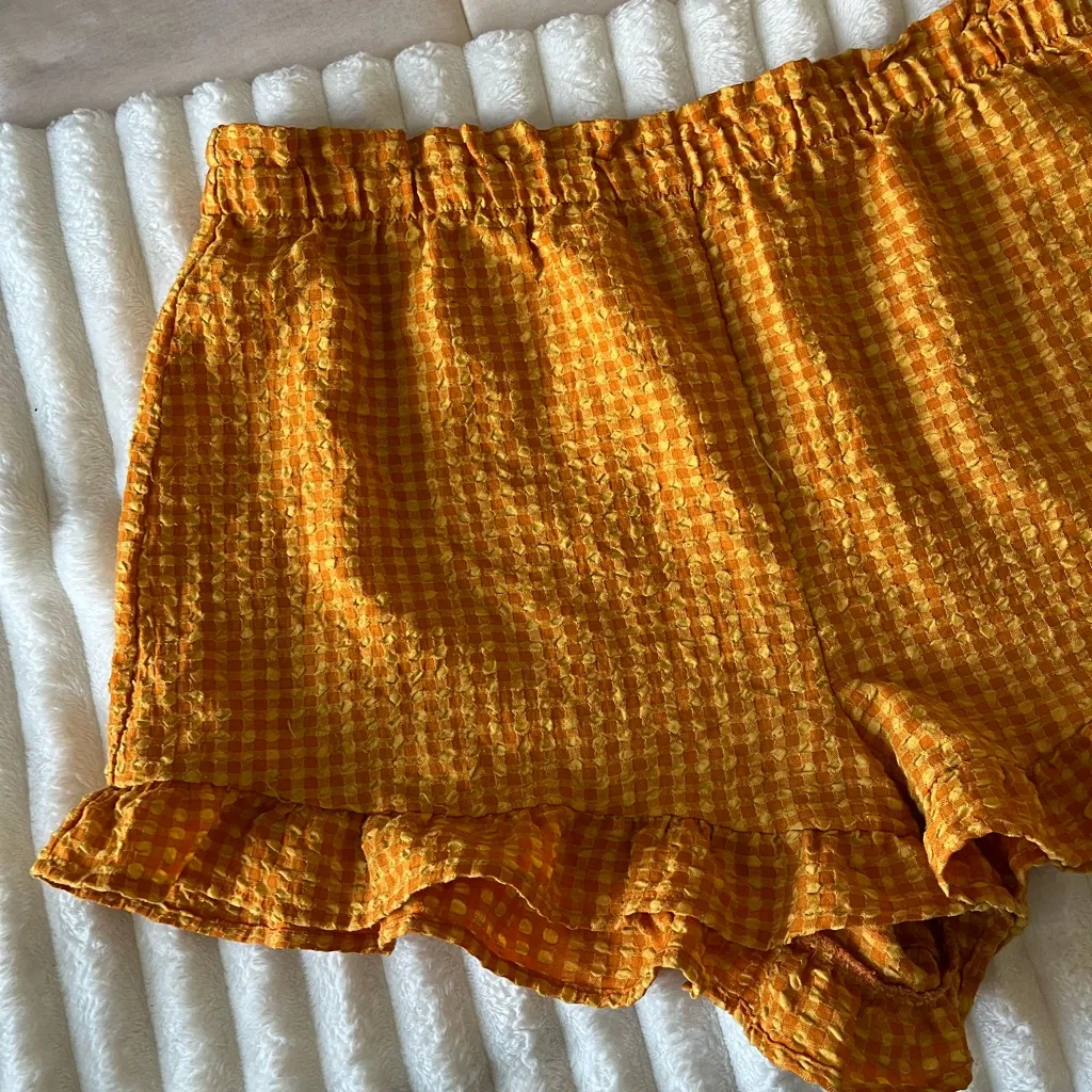 Chic gingham pattern. Ruffle hem adds flair. Perfect for casual outings. Size large Gingham shorts... Show more