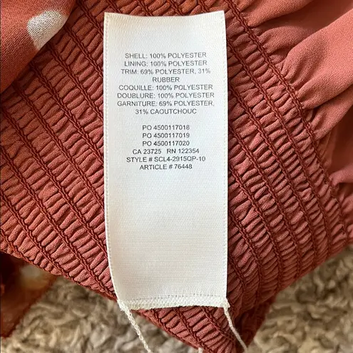 Wilfred Rust Orange Creme Polka Dot Smocked Cropped Tank Top - Size Small Features: Smocked waist Adjustable bow tie straps Ruffle trim 100% polyester Note: there is a stain on inside but does not go through to outer layer. Please see close up photo. Pit to pit: 15.5 inches (laying flat, stretchy) Length: 12 inches (does not include straps since they are adjustable) Tags: elegant charming delicate feminine summer warm weather flattering casual brunch boho bohemian girly