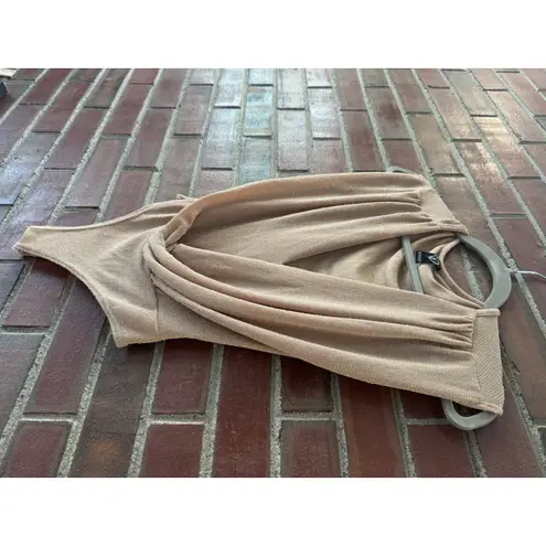 Windsor bodysuit in champagne/nude with subtle sparkle shimmer, size XS. Features deep crossover V-n... Show more