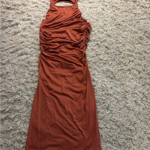 Chic backless design. Rich terracotta hue Maxi knit dress Spaghetti straps orange color square neck... Show more