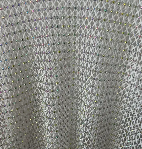 Shine all night in this Windsor rhinestone mesh crop top! Designed in white fishnet mesh with irides... Show more
