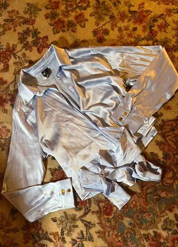 Silky blue long sleeve blouse with long ties that can be wrapped for a modest look or tied in front... Show more