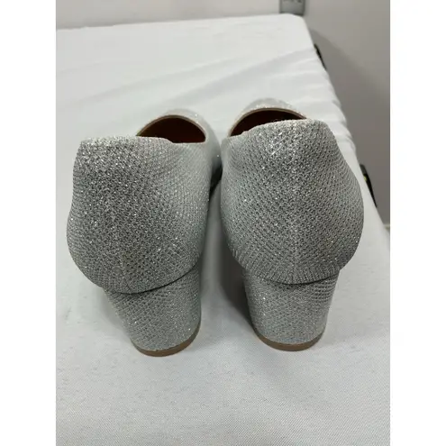 This is a pair of women's slip-on pumps by the brand IDIFU in size 9, featuring a silver sparkly color, 2.5” block heel and round toe. Made with man-made materials, these mid-heel pumps have a stylish pump design, making them a versatile and chic option for any outfit. The slip-on closure adds convenience and ease of wear, while the block heel provides stability and comfort for all-day wear. Perfect for adding a touch of glamour to any ensemble, these silver pumps are a must-have addition to any woman's shoe collection. These pumps are New With Defects! They have a slight stain on them. (See photos)