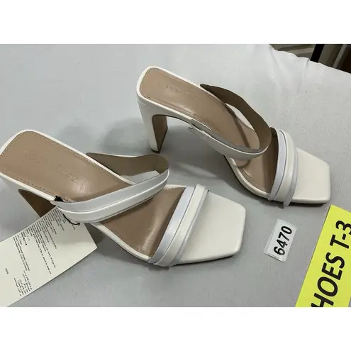 This is a pair of women's strappy slip-on sandals in white, featuring a 3.5” block heel. The sandals are from the brand The Drop and are size 9 . Made of faux leather, they have a high heel height. The stylish design and comfortable fit make them a fashionable and versatile choice for any woman's wardrobe. These sandals are NWT!