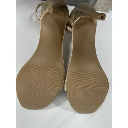 The Women's Wild Pair Blaire Slip-On Open Toe Stiletto Sandals in size 6.5M are a glamorous addition to any wardrobe. With their ankle buckle closure and 4” high stiletto heel, these gold sandals are both stylish and comfortable. The slip-on design and open toe theme make them easy to wear for any occasion, while the man-made upper material ensures durability and quality. Perfect for those who love a touch of luxury and want to make a statement with their footwear. These sandals are pre owned and look to be in excellent condition!