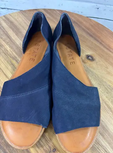 These are a pair of women's 1. STATE flat sandals in navy blue, size 7.5 M/38. The sandals feature a... Show more