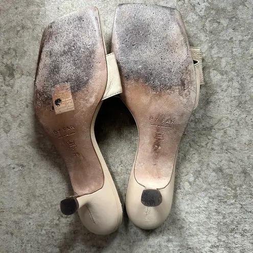 The product is a pair of Women's BY FAR Beige Mules with kitten heels and a silver buckle, made of leather. The size is 38 (EU) or 8 (US). These stylish shoes are perfect for casual occasions during the summer, fall, and spring seasons. The mule style with a kitten heel and leather upper and lining materials make them a fashionable and comfortable choice for any woman's wardrobe. The branded design from BY FAR adds a touch of sophistication to any outfit. In great condition Smoke free home Size 38