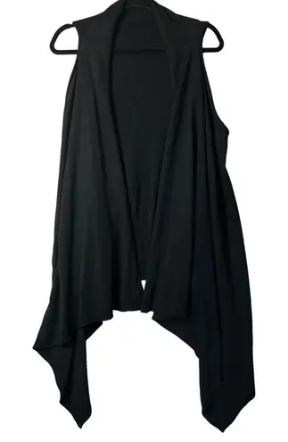 This black sleeveless cardigan features a draped hem and open front design, offering a stylish layering option for versatile and effortless outfits. • Sleeveless design with open front • Draped waterfall hem for added style • Lightweight material ideal for layering • Casual and versatile design Length from shoulder to longest point on hem approximately 44 inches. One Size fits most up to 23" Pit to Pit.