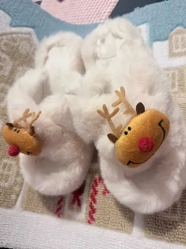 women's white fuzzy reindeer slip-on slippers, featuring a plush fabric and cute cartoon reindeer design. Size 5.5 - $29 - From Mayra