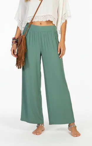 Elastic waistband Pull-on closure High rise Wide leg fit Woven fabric Rayon blend material Fully lined Solid green colorway Flowy drape Relaxed silhouette Bohemian Coastal Resort Beachy Cottagecore Casual Summer Approx. Measurements: Waist: 28" Rise: 13.5" Inseam: 31" Leg opening: 15.5"