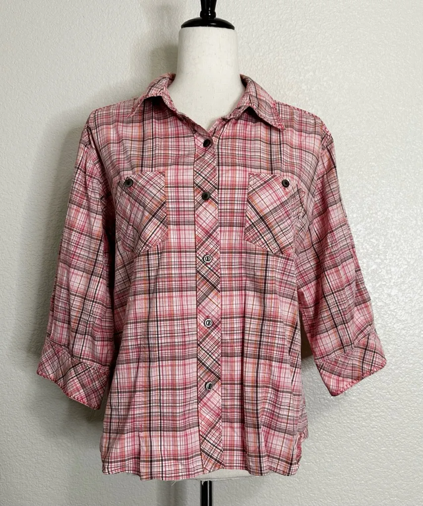 Size: Medium Petite Multicolor Plaid (Red, Pink, White, Black, Gray) - Front Button Down closure - Collared - 3/4 Sleeves with button cuffs - Two front pockets with button closure - 98% Cotton, 2% Spandex (Missing material tag) - Imported Excellent Pre-owned Condition Pet/Smoke free home Measurements Approx: Pit to pit: 20.5” Length: 23.5” Sleeves: 15.5” Tags: casual summer spring autumn fall vacation travel western festival comfy contemporary minimalist