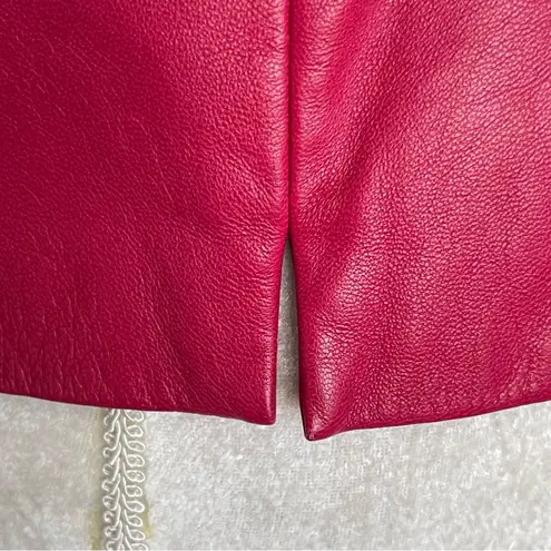 Soft leather Quilted Collarless Small side sleeves Long sleeves with snaps at cuffs Zip front closure Front pockets Lined Pre-owned in good condition *Some wear at cuffs and a small stain in one sleeve below the elbow* Size 8 Approximately measurements Chest 20” Length 22.5” -2.