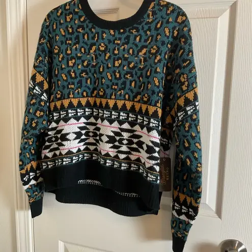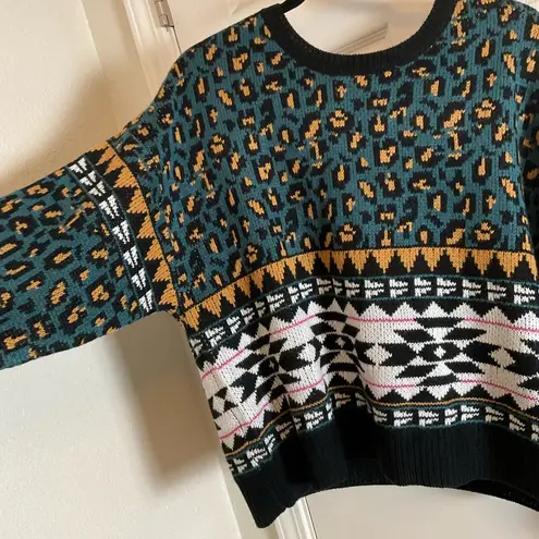 Stay stylish and warm with this multicolor patterned sweater. Featuring a vibrant mix of blue, orang... Show more
