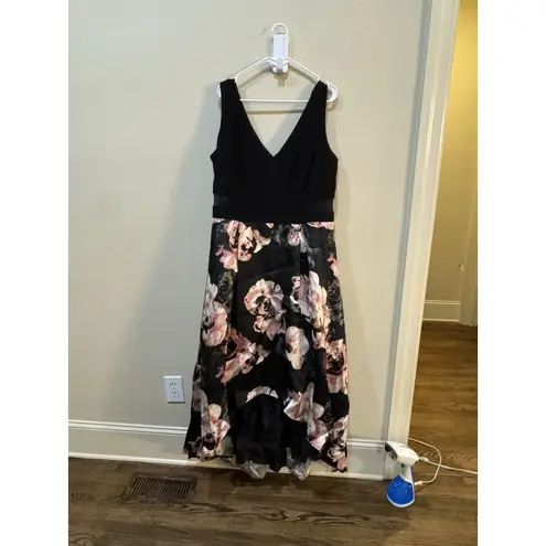 Look stunning in this XSCAPE gown with a solid and floral-print design. The wide strap and V-neckline add a touch of elegance while the mesh cut-outs and hi-low dress length make it a perfect choice for formal occasions and parties. The polyester blend material ensures comfort and durability. The dress is perfect for plus-size women, with a size of 16W available. The fit and flare style and ball gown design make it a perfect choice for a bride or a bridesmaid. The dress is multicolored, with a beautiful flower theme that complements the overall design.22220. Hanging