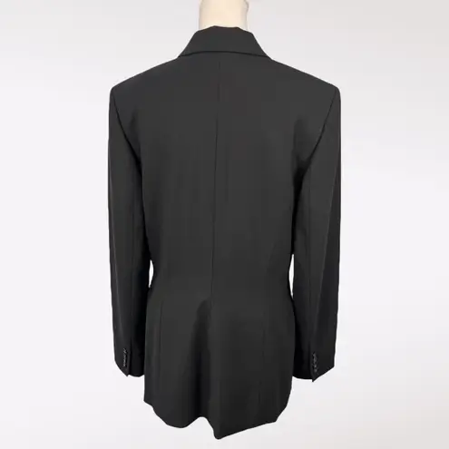 Classiques Entier wool blend blazer with tailored structure and a notched lapel. A Nordstrom label from the early 2000s with a refined, minimalist look. • 3-button front closure • Shoulder pads, front welt pockets • Long sleeves with button cuffs • Fully lined interior • Shell: 96% wool / 4% spandex • Lining: 95% polyester / 5% spandex • Black Very good condition; light discoloration under right arm, a small spot below the second button, and two faint marks on the interior lining (see photos). No holes or tears. SIZE 6 measurements laid flat sleeve: 24.75" shoulders: 16.5" bust: (pit to pit) 18.3" length (shoulder to hem): 29.5" bottom hem (laid flat + across): 20.5"