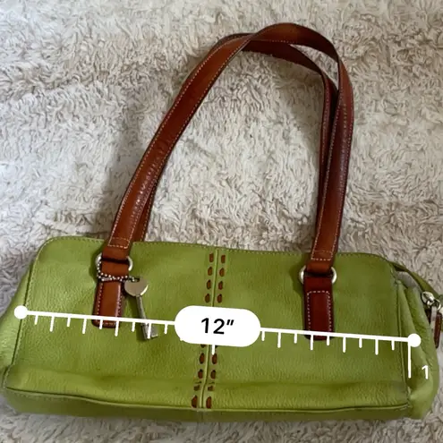 Stylish green leather handbag featuring elegant brown straps. Perfect for adding a pop of color to a... Show more