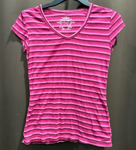 Chic and comfortable short sleeve tee. Features vibrant pink and purple stripes. Ideal for casual ou... Show more