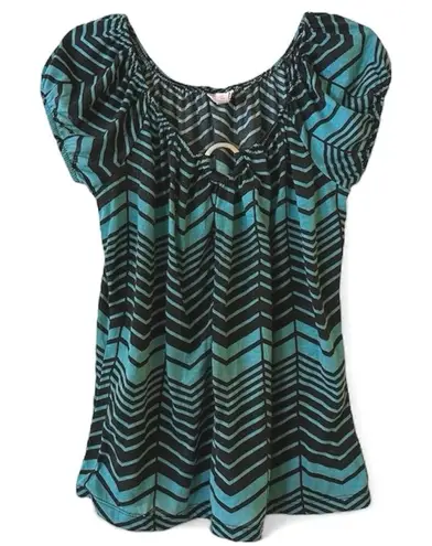 One step up shirt. Black & blue chevron zigzag pattern. Short sleeves. Neckline & sleeves have elastic hem. Keyhole is a silver ring. Soft polyester. Machine wash gentle. Tumble dry low. Size 1X (maybe juniors) and fits an XL too. Dress up with a skirt, dress pants or wear casually with shorts. Tags: university, streetwear, streetstyle, hiphop, funky, Maximalist, dopamine, dancecore, barbiestyle, barbiecore, bratz, y2k, y2kvintage, y2kstyle, indievanguard, emo, edgy, punk, bohochic, hippie, hippy, phoebebuffay, utility, techwear, bohowestern, southwestern, santafe, western, country, weddingguest, Businesswear, officewear, workwear, officesiren, mobwife, retroglam, twee, quirky, indiepop, cutegoth, softgoth, whimsygoth, fairycore, fairy, whimsical, festival, rave, futuristic, chrome, glamrock, rockabilly, Pinup, punkrock, rocker, rockerchic, grunge, vacation, industrial, alternative, nostalgic, travel, cruise,