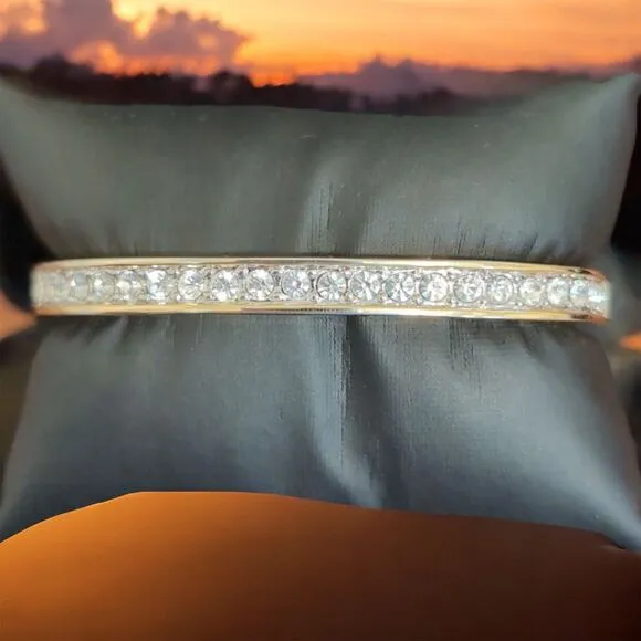 Radiate elegance with this stunning diamond cz bangle bracelet. Crafted in lustrous yellow gold, this piece effortlessly combines the timeless allure of diamonds with a sleek, modern design. The hinged closure ensures a secure fit, making it perfect for any occasion, whether you're dressing up for a night out or adding a touch of sophistication to your everyday look. Its classic gold hue complements any outfit, adding a dash of luxury to your ensemble. This pre-owned bracelet is in excellent condition, ready to become a cherished addition to your jewelry collection. 2.5 inches wide by 2 inches Brand: Unbranded Metal: Gold Tone Metal purity: Unknown Style: Bangle Type: Bracelet Closure: Hinged Color: Gold Features: Hinged