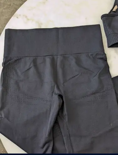 Its' sweat absorbing material is double layered throughout the bra with removable breast pads. Leggings waistband is double layered with a designed elastic band. These are a bit sheer. NWOT Size: Small Material: 90%Nylon 10%Spandex Sports Bra Flat Measurements Underarm to Underarm: 13-15" Waistband: 12-14" Underarm to Hem 4" Shoulder to Hem 8" Leggings Flat Measurement Waist: 12-15" Rise: 9" Inseam: 22" Check listing for more workout sets! Mask sold separately