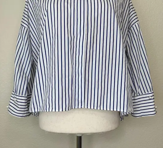 Size: XS Color: Blue, White - Front Button Down Shirt - Collared - Long Sleeves - Pearl accents on... Show more