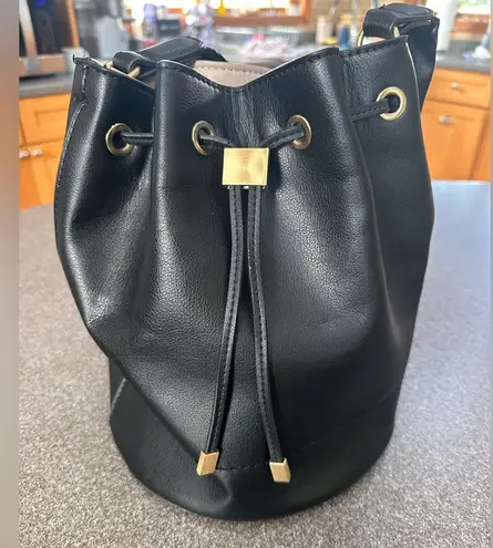 Zara brand Black bucket bag with gold hardware and large tie detail. Adjustable strap is missing. Dr... Show more