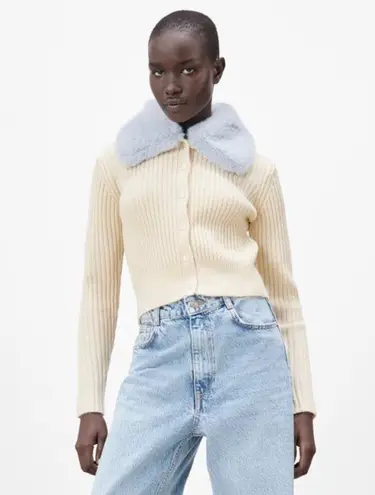 LONG SLEEVE CARDIGAN WITH FAUX FUR COLLAR. FRONT BUTTON CLOSURE. VLOGGER FAV. COLOR: ECRU/BLUE