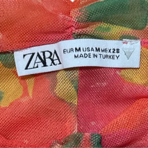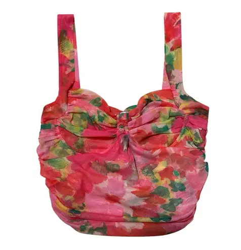 Vibrant Zara bustier-style mesh crop top in a painterly multicolor floral print. Ruched/scrunched fr... Show more