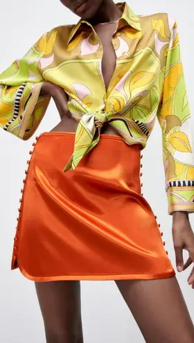 High-waisted satin effect mini skirt. Self-lined buttons at side. Hidden in-seam zip closure