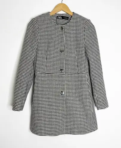 Chic and structured ZARA houndstooth tweed jacket featuring bold silver snap buttons and a classic s... Show more
