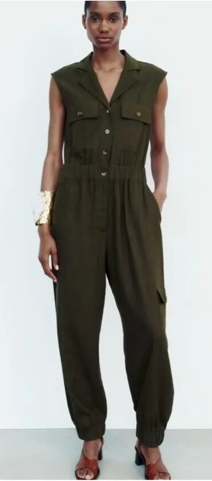dark green jumpsuit from Zara. Sleeveless with button-up front. Includes chest pockets.Elastic waist... Show more