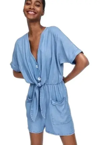 Light blue chambray short sleeve tie front romper with v-neckline, button accents, and pockets by Za... Show more