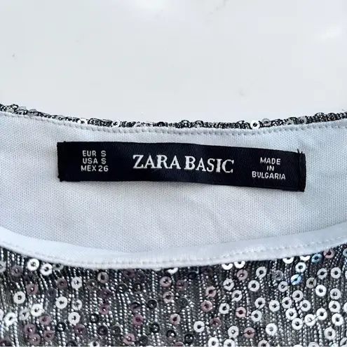 Zara long-sleeve semi-sheer silver sequin crop top with light gray under-layer slip that includes th... Show more