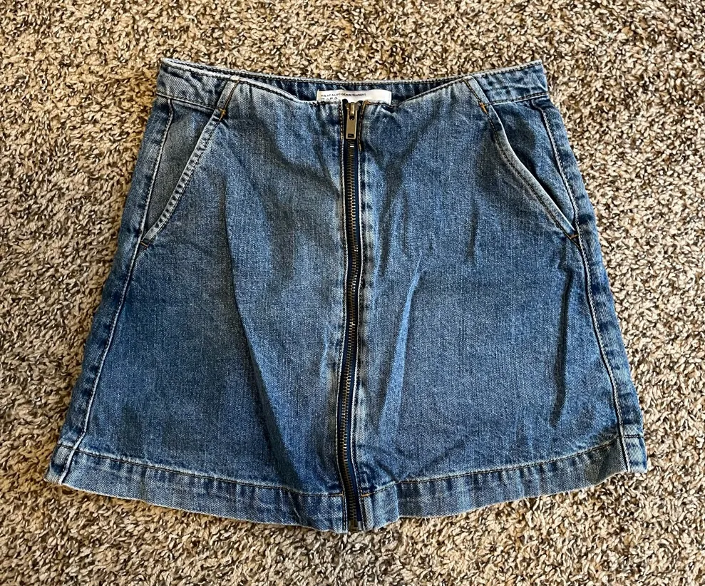 Chic mini skirt with front zipper. Classic denim style. Ideal for casual wear.