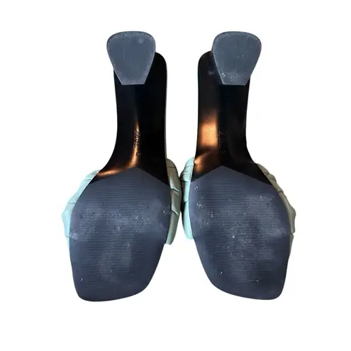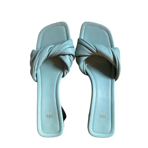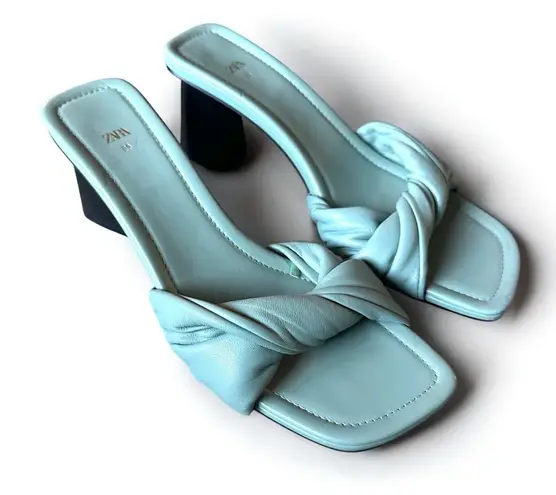 Chic and modern ZARA block heel sandals in a soft mint green faux leather with a stylish twisted kno... Show more
