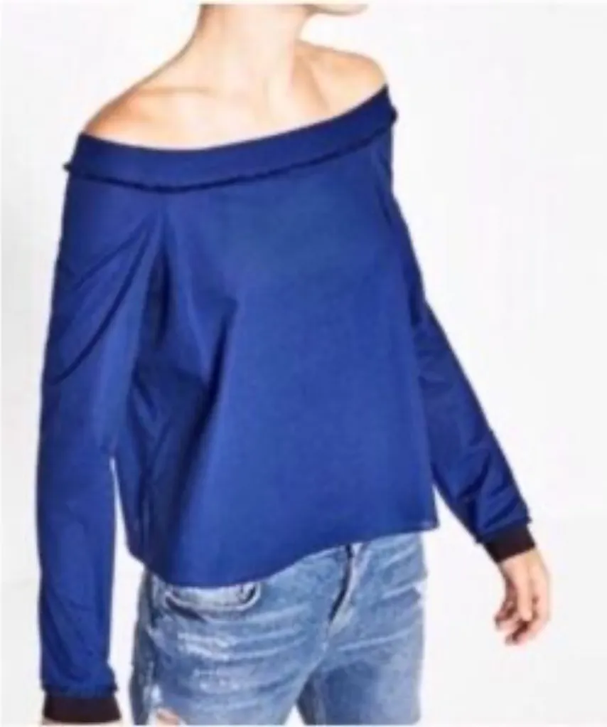 Stylish off-shoulder top in a deep blue shade with an open back. Like new