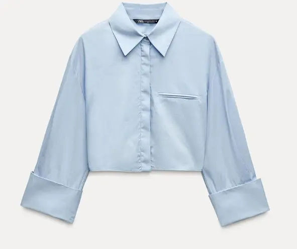 Stylish light blue cropped shirt. NWT size Small Cropped shirt with lapel collar and long sleeves... Show more