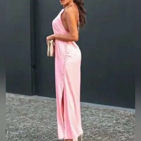 NWT. Zara Dusty Pink Satin Effect Midi Dress with Buttons, halter neckline, adjustable ties at collar, self lined buttons at side, slit at hem.
